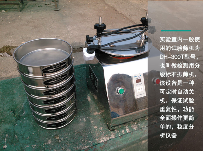 實驗室內一般使用的試驗篩機為DH-300T型號,也叫做檢測用分級標準振篩機,該設備是一種可定時自動關機,保證試驗重復性,功能全面操作更簡單的,粒度分析儀器。可將一種顆粒料同時精密分出2~8個粒子段。可用于漿液料的細度及雜物含量分析,噪音小,重量輕;平臺操作,無須固定。調節振動快,可調節振幅。