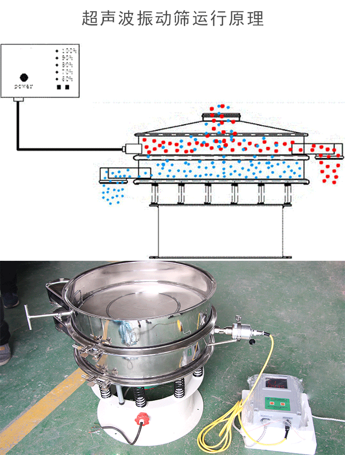 超聲波振動篩是將220v、50HZ或110v、60HZ電能轉(zhuǎn)化為38KHZ的高頻電能,輸入超聲換能器,將其變成38KHZ機械振動,從而達到高效篩分和清網(wǎng)的目的。超微細粉體接受巨大的超聲加速度,使篩面上的物料始終保持懸浮狀態(tài),從而抑制粘附、摩擦、平降、等堵網(wǎng)因素。解決了強吸附性、易團聚、高靜電、高精細、高密度、輕比重等篩分難題,使超細微粉篩分不再難事,特別適合高品質(zhì)、精細粉體的用戶使用 高頻振動篩采用筒體式偏心軸激振器及偏塊調(diào)節(jié)振幅,物料篩淌線長,篩分規(guī)格多,具有結(jié)構(gòu)可靠、激振力強、篩分效率高、振動噪音小、堅固耐用、維修方便、使用安全等特點。由于高頻振動篩采用了高頻率,一方面破壞了礦漿表面的張力和細粒物料在篩面上的高速振蕩,加速了大密度有用礦物和析離作用,增加了小于分離粒度物料與篩孔接觸的概率。